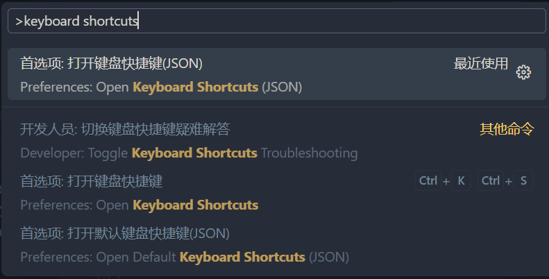 Ctrl+Shift+P打开搜索框,输入settings选择Open User Settings: -
